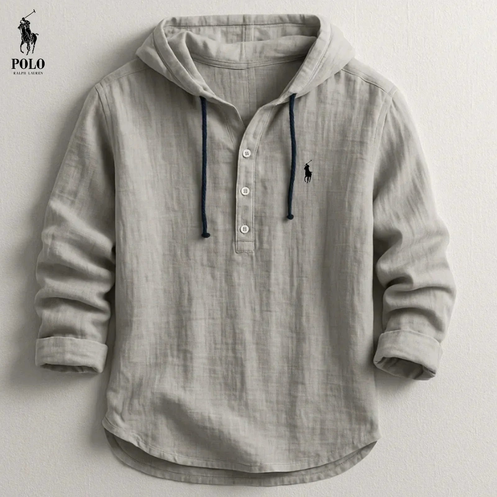 The design features an adjustable hood and a three-button placket for a modern, casual look. Finished with clean lines and a slightly loose fit, it adapts perfectly to every silhouette, combining practicality and elegance in one piece.